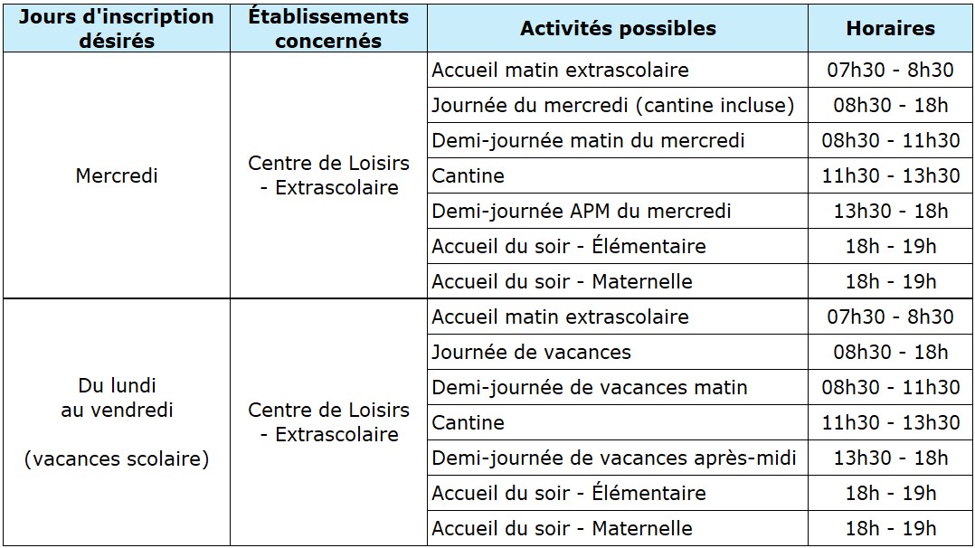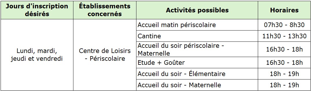 - Services périscolaires : lundi, mardi, jeudi et vendredi