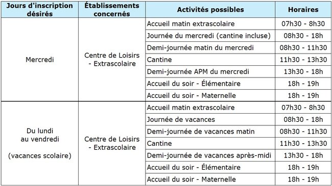 Attention : toute inscription ou désinscription doit être effectuée avant 12h le jeudi de la semaine précédente ET au plus tard 15 jours avant le 1er jour des vacances scolaires.